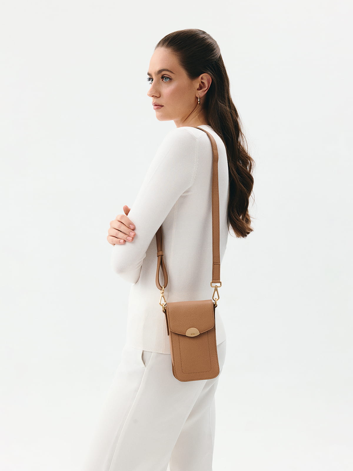 CALLIE beżowa latte skórzana torebka na telefon torebeczka na telefon